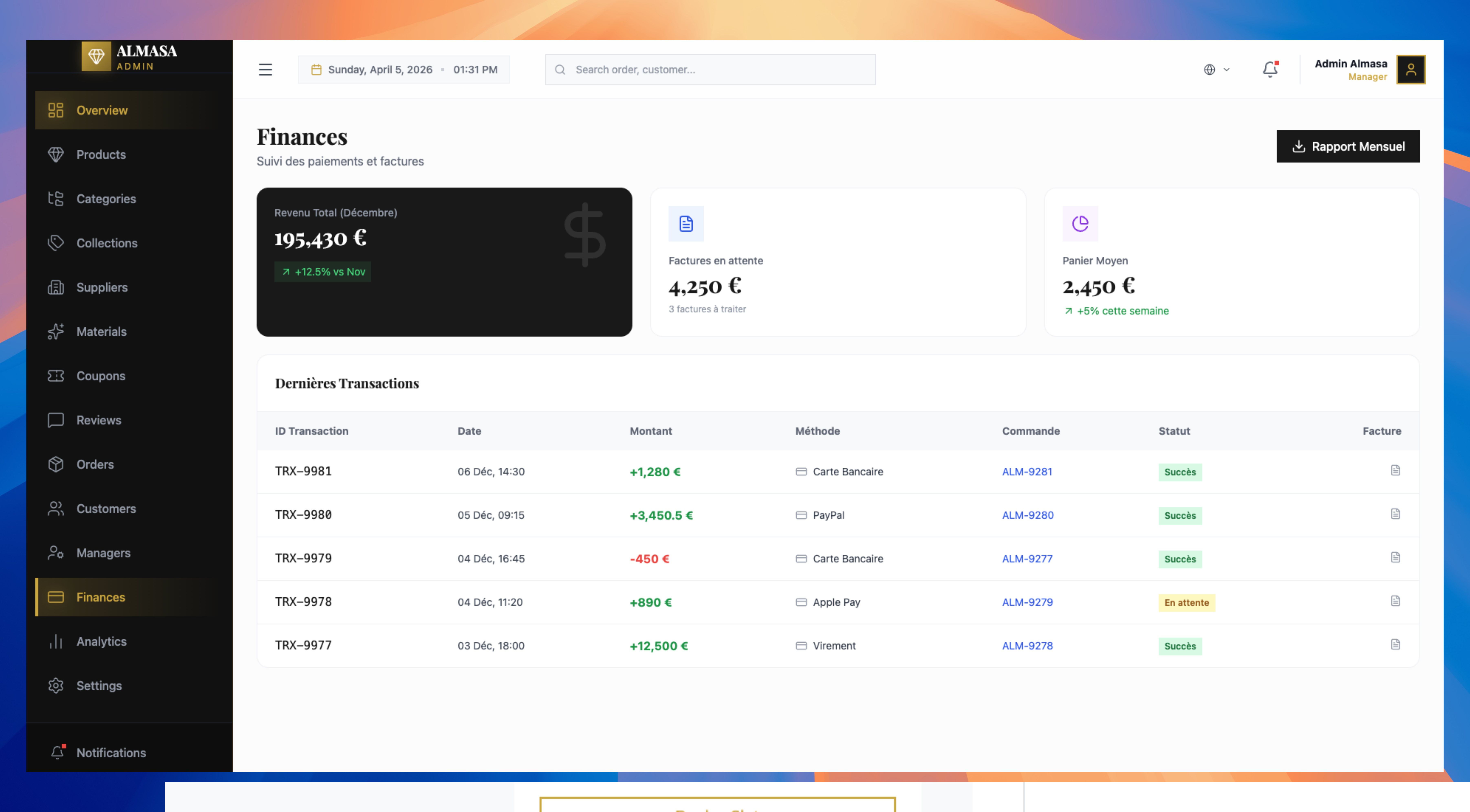 Almasa est un projet full-stack e-commerce orienté bijouterie, construit avec Next.js côté frontend et NestJS + Prisma + PostgreSQL côté backend. L’application inclut un catalogue produits, panier, wishlist, tunnel de commande avec Stripe, gestion des comptes clients, ainsi qu’un back-office complet (produits, catégories, collections, coupons, commandes, fournisseurs, analytics). Le projet gère aussi la localisation fr/en/ar et met l’accent sur une base technique propre et évolutive.